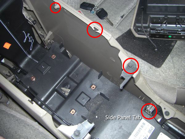 You will need to remove the bolt and 1 screw from black plastic storage compartment liner on the left as well. (You can see the broken remains of the liner still bolted in place.) It's been removed here, but you shouldn't need to remove yours. Note you will have to life up the black plastic storage compartment liner as you remove the side panel. There is a tab on the side of the liner. You can see the cutout in the picture. I've also noted the Side Panel Tab. This is just for reference. When you remove the side panel you need to lift up before you lift out.