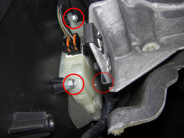Here is the source of all the trouble. This actuator is above and in front the metal bracket now removed. When you see how tight this is, you should you be impressed with my photograph. I just jammed my camera under there and started clicking. This is a great shot but it fails to show how difficult it is to get to those bolts with regular tools. This is where my patience and neck muscles were tested several times. 3 bolts hold the actuator in. You can see two here. There is one bolt on the opposite side, too.