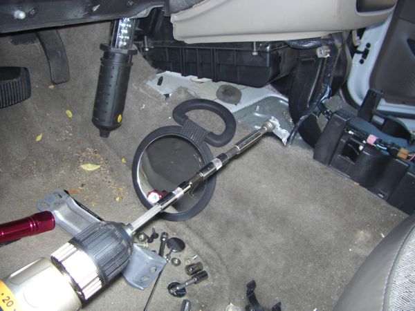Here is a close-up of the driver side foot well with the panel removed. I removed the bolts circled in red. The metal bracket in the way and had to come out. The black plastic air duct was in the way too. Both parts removed easily.