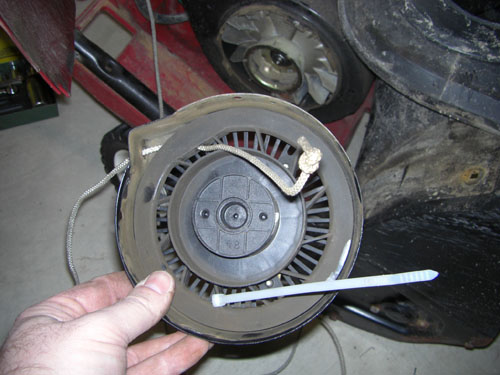 The reel spring is under tension now. I put the reel back into the installed position. I PULLED THE CORD OUT TO ITS FULL LENGTH AS IF I STARTED IT. Then I put a cable tie through the spokes of the wheel attaching it to the reel casing. Now the reel spring is properly tensioned. Now it's time to cut the cord. When you do, the cable tie will hold the reel in place. Use the cut cord to size your new pull cord to the proper length.