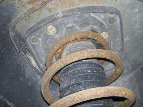I have the nuts off the bolts holding the strut in. Before I hammer them out, I have to support the wheel hub so it doesn't fall when the bolts come out. Before I hammer the bolts out, I removed all the nuts from the upper mount inside the trunk. With the jack under the hub the upper strut mount is held in place and doesn't shift around.