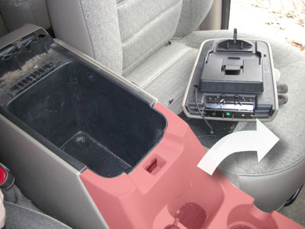 Again, I removed too much. You can leave the console door/arm rest on. I've detailed in red the part of the console which lifts up. This was confusing for me. I removed the 4 bolts in the bottom of the arm rest storage compartment. I then lifted the black plastic storage compartment liner up. The plastic liner is held in with 2 additional bolts which are under the area marked in red. THIS WAS THE WRONG THING TO DO. Just lift the area marked in red up. It's held in with 2 spring metal clips. I managed to break the post the springs attached to and made a mess of things. I glued everything I broke back together. (The damage was repairable. There are no rattles coming from the console, now reassembled.)
