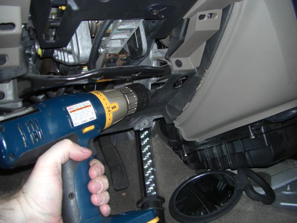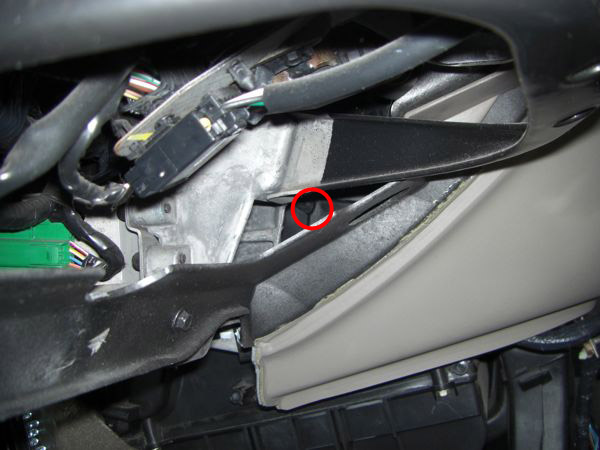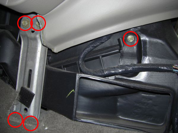 Here is a close-up of the driver side foot well with the panel removed. I removed the bolts circled in red. The metal bracket in the way and had to come out. The black plastic air duct was in the way too. Both parts removed easily.