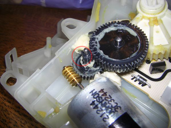 Here's where all the trouble comes from. Can you see the missing teeth on the small gear driving the large black gear? Two tiny teeth are missing. This is where the clicking sound comes from. I bought a Dorman 604-209. It's a perfect match. I paid about $40 for this part using an Advance Auto coupon. A reader in California reported the Ford part cost $73.00. (4-25-2010). I don't know which will prove more durable.